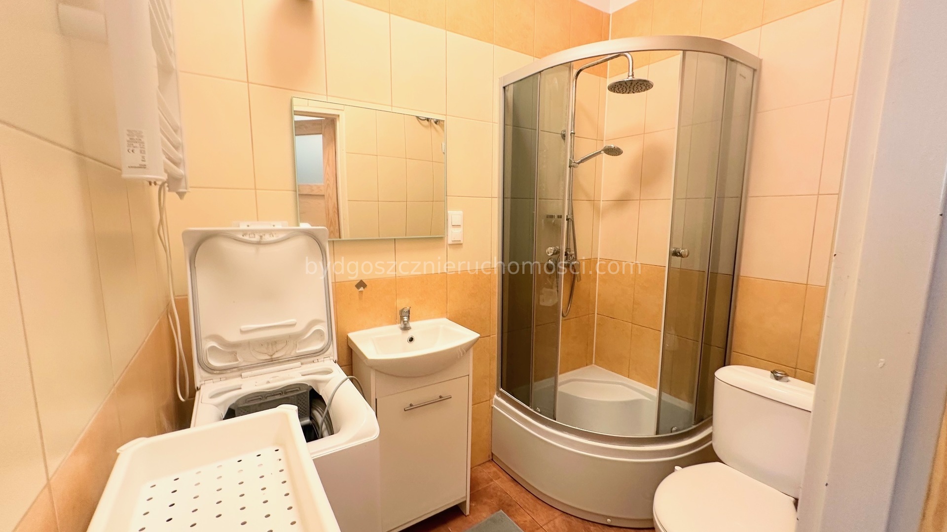 Mieszkanie posiada ustawny pokój z kuchnią oraz łazienkę z prysznicem i pralką.