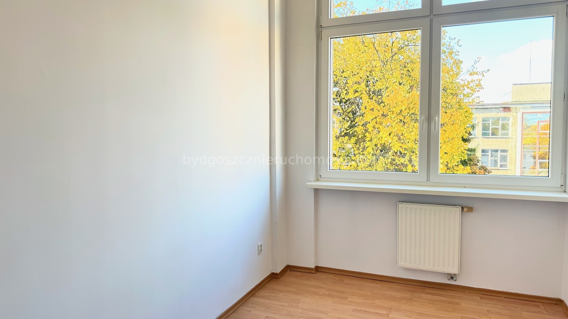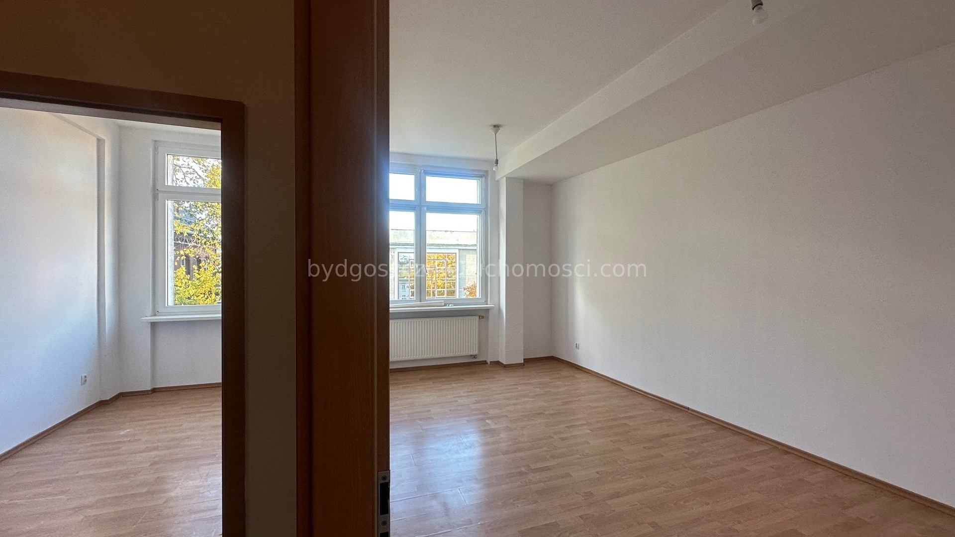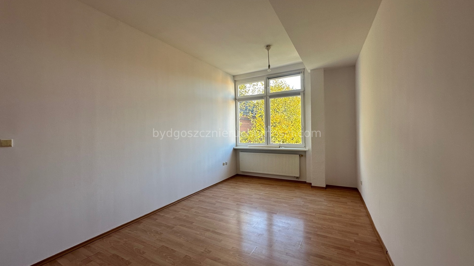 Mieszkanie nieumeblowane. Na podłogach panele. Okna PCV.